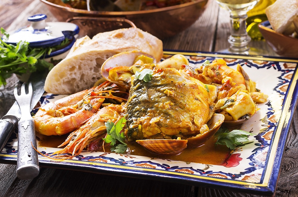 Food unsurprisingly also plays a large part in traditional seasonal and religious festivities. In the north of the country, at Christmas, it is common to eat octopus, but elsewhere there is usually a two course meal of bacalhau (dried cod) followed by turkey. It is said that there exist some 365 recipes for bacalhau – one for each day of the year – but actually there are even more: maybe in the region of 600-700 would be a more accurate estimate. A longstanding Portuguese favourite, the cod is dried because it is not actually native to the Atlantic coasts and needs importing. The first stage is to rehydrate the cod, so that it gains around 60% more weight, a process which, depending on size, may take 24-36 hours. When it is ready, the flesh will fall apart very easily. In the north, a popular recipe is to mix the fish with fresh olive oil, straight out of the press, creating something like a confit, which is served with potatoes and kale. Further south, it is more commonly grilled with garlic and olive oil, or boiled and served with potatoes, vegetables and again – this seems to be the common denominator – lots of olive oil. One tasca recipe – traditionally a snack for poor people – involves mixing the cod with olives, pickles, onion, chopped parsley, chopped coriander and olive oil, and serving it like a ceviche. The recipe most popular with visitors to Portugal is known as golden bacalhau (or bacalhau dourado). It consists of very thinly sliced ‘straw’ potatoes and shredded bacalhau, served with a mixture of olive oil, onion and garlic, stewed, mixed altogether and finished with eggs, from whence the golden colour.