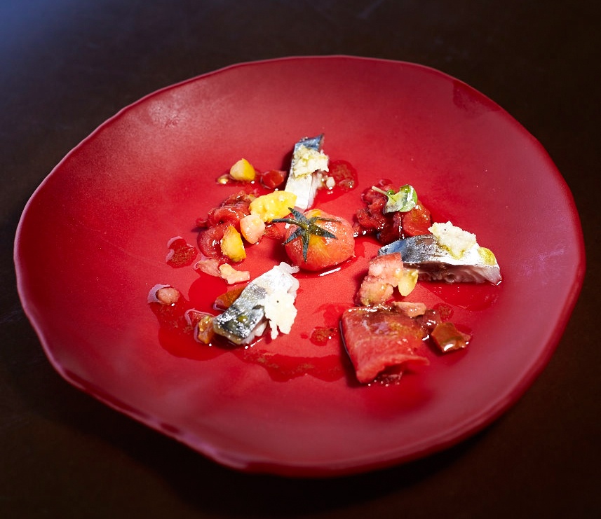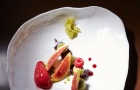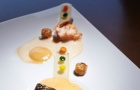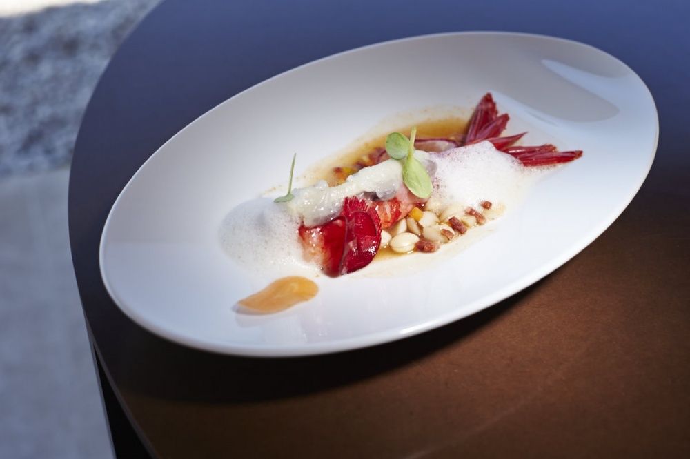 Moving across to the round and convivial table, there was a selection of bread – white, cereal and vegetable (courgette, onion and garlic) – served with a trio of butters (pecan, neutral and basil). The specially prepared menu delighted us with aesthetically and gustatorily pleasing dishes, including a delightfully iced watermelon carpaccio accompanied by mackerel ceviche, confit of tomato and basil, followed by scarlet shrimp (the much loved carabiniero from the Algarve coast) on a bed of Portuguese stew, comprising white beans and chouriço, and topped withseaweed foam (dashi). These were both paired with a white wine from the Dão region, M.O.B. 2012.