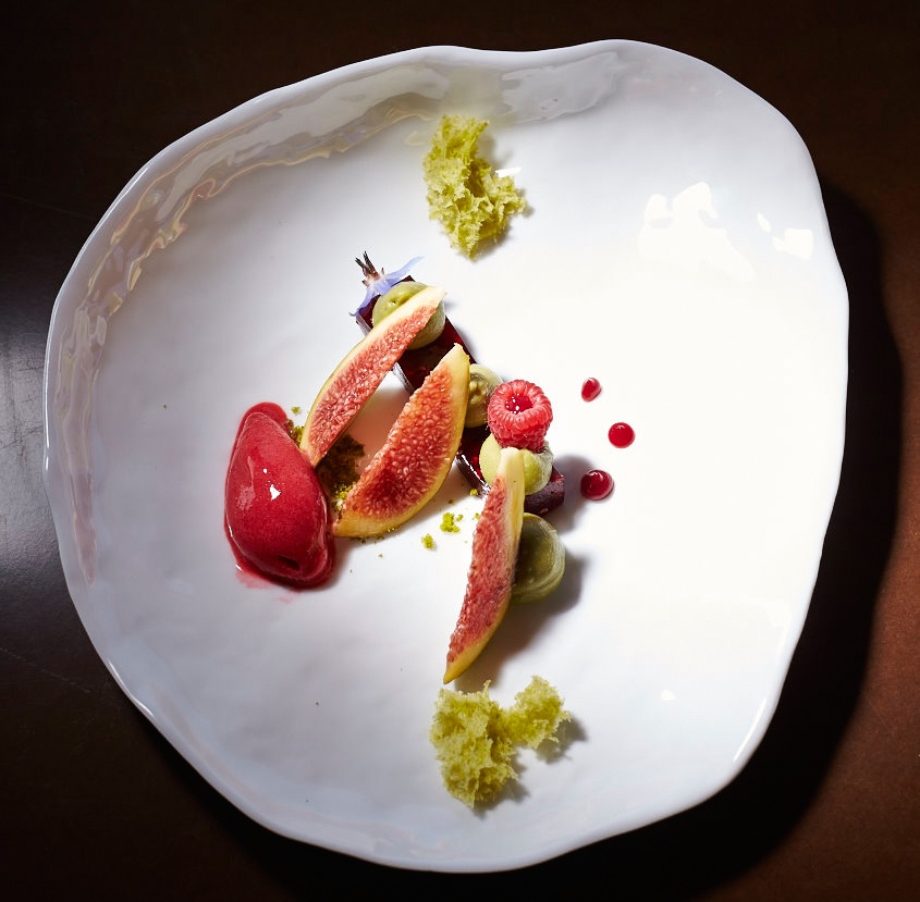 Finally, our two dessert courses consisted of a tangy serra cheese ice cream and foam, contrasting delightfully with a sweet guyaba ice cream and jam, decorated with crunchy granola, followed by a raspberry sorbet and jam strip, served with pistachio sponge and cream, fresh fig, and a decorative borage flower. To accompany these came a delicious LBV Port 2008 from the Quinta da Portal, a cellar designed by the same architect as the Casa. Coffee and sweet delicacies closed the experience, served outside on the rocks.