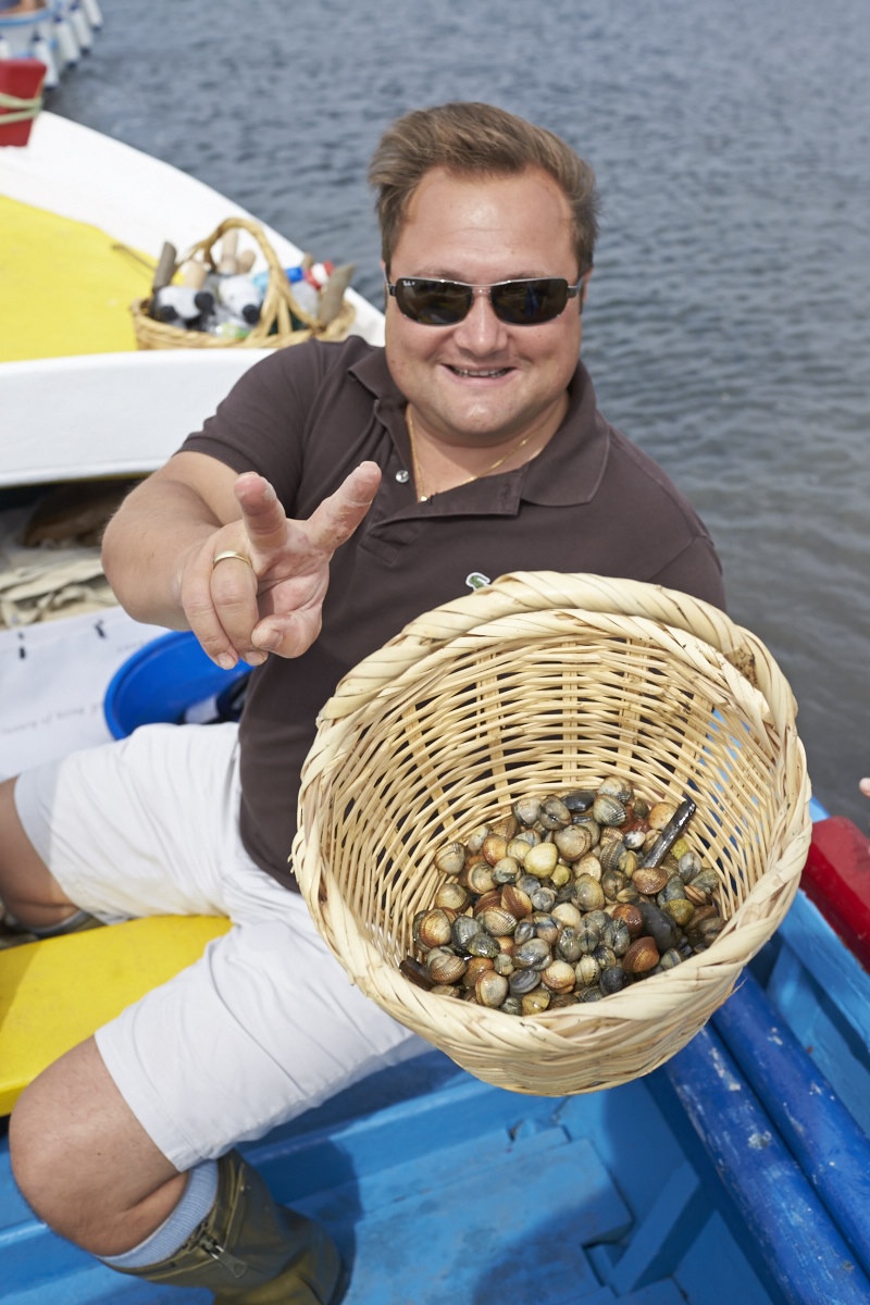 Traditional fishing boats have long since been replaced by modern fibre ones but Portugal No Limits has managed to recover and restore a number of old ones to offer tourist these exciting opportunities. The clam picking day trips are typically accompanied by chefs, who afterwards give a demonstration of how to prepare the seafood in their kitchens We were accompanied by Hans Neuner and Florian Ruehlmann from Ocean, Pedro Bastos from Nutrifresco and Heinz Beck, Mike Bräutigam and the General Manager Joachim Hartl from the Conrad Algarve.