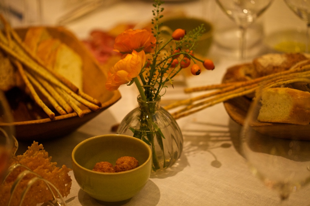 As guests began to arrive, canapés of warm and salty truffle arancini and crisp and light parmesan tuiles were brought out, accompanied by Colinas Rosé from the Bairrada region between Porto and Lisbon, a well integrated wine with notes of almond and butterscotch, blended from two Portuguese grapes (Touriga Nacional and Jaen) and the French grape Pinot Noir (but harvested from Portuguese soil).