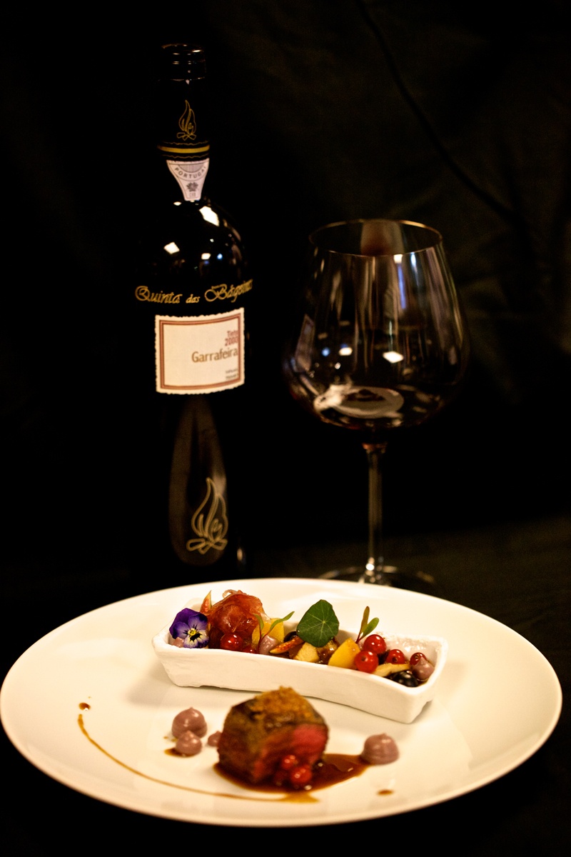 Sinthon now took over the menu, offering another game course of medaillons of peppery venison served with a celery and Port wine reduction and a side dish of figs, quince, mixed berries, chestnut and pata negra – a real taste of autumn. This was accompanied by a mature Baga red, Quinta das Bágeiras Garrafeira, again from the Bairrada region, with dark berries and earthy flavours, a nice complex finish, a pleasant acidity and mature tannins to cut the proteins of the venison.