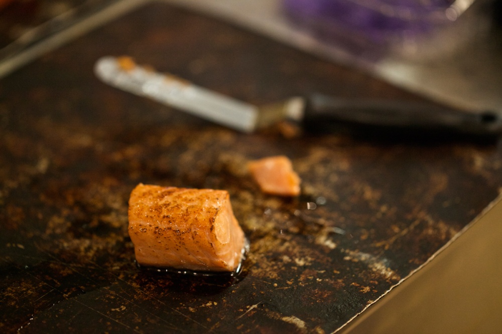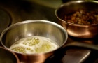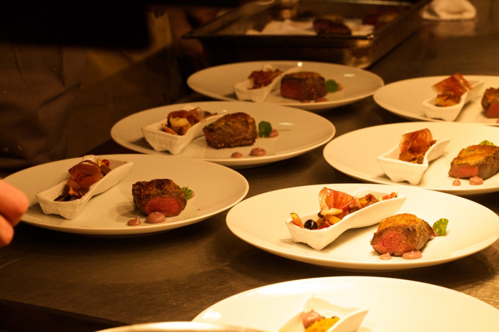 The first starter course was Haworth’s wood smoked Kilnsey trout loin, sourced from a small fishery near to Northcote. With the loins cut from a 2kg fish, he coated them in salt and sugar for 50 minutes before slow cooking them for ca. 5 minutes at 46ºC. Finishing the loins with a blowtorch left them with a ‘raw and cooked’ texture, with a subtle barbeque effect. The fish was served with fennel pollen, sweet onion puree, sweet onion bulbs and ‘hints of the garden’ – dehydrated nasturtiums from the Northcote garden, a delicacy which should be left to settle on the palate and then chewed to release the flavour. This was paired with Esporão Resrerva 2013 from Herdade do Esporão in the Alentejo, one of the biggest Portuguese wineries, producing 1 million bottles a year (although this figure highlights the relatively low production of Portuguese wines in international comparison – it’s certainly a case of quality over quantity!). A blend of four grapes – Antão Vaz, Arinto, Semillon and Roupeiro – the wine was served in bell shaped glasses to allow it to fully open out. Sweet on first encounter, it contains lots of citric, fruits, some minerality and a hint of smokiness at the end, which complemented the barbecue taste of the fish.