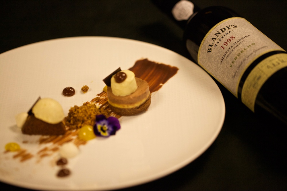 After a lemon sorbet palate cleanser, Sinthon brought out his pièce de résistance: a temptation of tainori chocolate, Madeira banana and passion fruit. The mixture of bitter cocoa flavours, sweet banana, and perfectly balancing acidic passion fruit gave the dessert a tropical feel, conjuring up the Madeiran island in the minds – and palates – of the guests. And what else could be drunk with this but a Madeira wine? In this instance, Sinthon had selected Blandy’s Verdelho Single Harvest 1998, served chilled to 14-17ºC. A dry wine with nutty flavours, less sweet than many a Madeira, also perfectly tropical. His one Michelin star restaurant on Madeira, Il Gallo d’Oro at the Cliff Bay Hotel, unsurprisingly has a long list of Madeira wines, ranging from an 1879 vintage to just 20-year-old bottles. ‘The acidity you can have in a Madeira is incredible,’ Sinthon explains. ‘You never imagine you can have such acidity in a sweet wine. Also you can keep a bottle for 30 or so years. It ages well if kept at the right temperature. You won’t be disappointed when you open it, like you can be with some other older wines.’